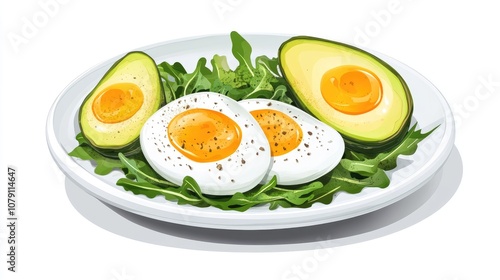 poached eggs with avocado and greens, minimalistic plate, healthy breakfast concept, isolated on white background
