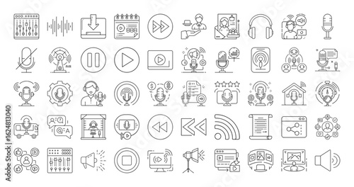 Podcast and audio related icon set in outline style vector design