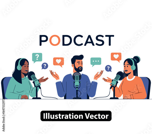 Podcast Illustration Diverse Hosts Discussing Engaging Topics