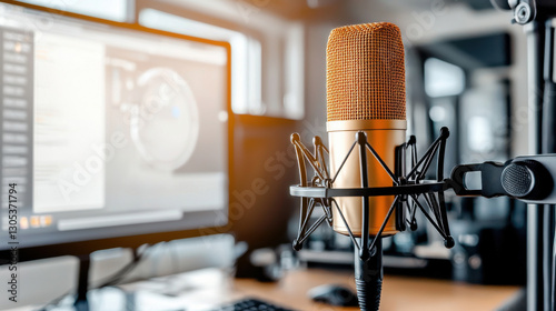 podcast studio concept, Cozy and stylish podcast studio with vintage microphone and computer