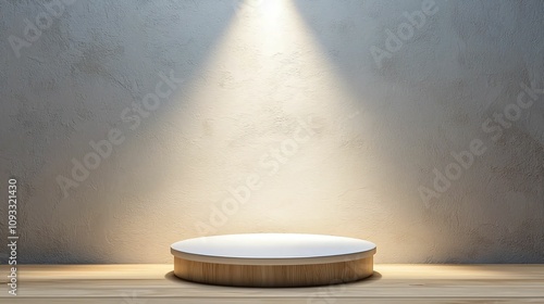 Podium and spotlighting, minimalist exhibition space. A minimalist display pedestal illuminated by a spotlight against a textured wall, creating an elegant presentation space.