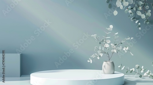 Podium background product cosmetic green platform display teal stand stage presentation mockup. Product pedestal eucalyptus background podium white 3D beauty minimal scene leaves studio photo design.