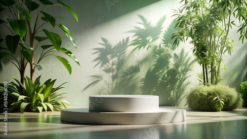 “Podium with nature shadow overlays and plant silhouettes in the background”