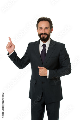 Pointing at business advertisement. Man pointing index finger advertisement isolated on white. Man bearded mature formal suit. Businessman or manager shows direction. Look at that advertisement