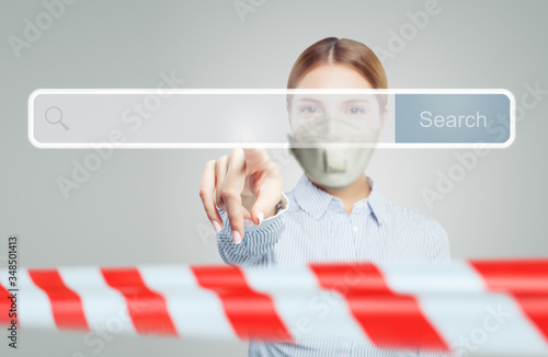 Pointing woman hand, empty address bar in virtual web browser with red warning tape
