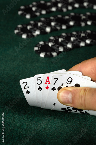 Poker cards with high card combinations in the hand of a gambler player. Winning combination in a game in a poker club on a green table. The idea of luck or fortune in gambling