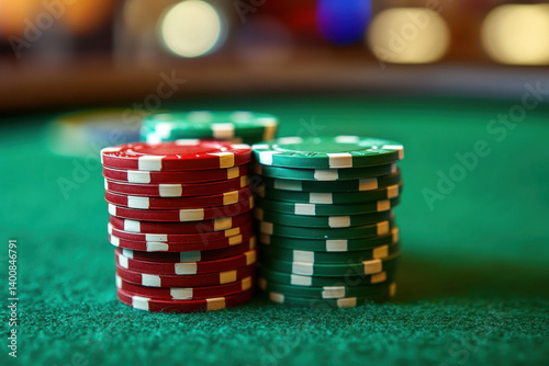 Poker chips scattered on a vibrant green table in a casino setting, creating a colorful and dynamic image of a gambling scene.