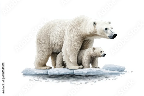 Polar Bear Mother and Cub on Iceberg in Arctic Landscape Surrounded by Snowy Environment
