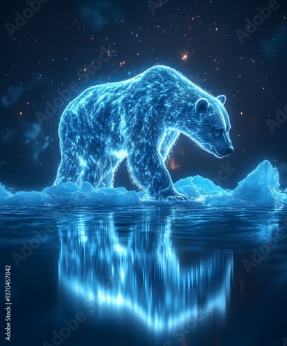 Polar Bear Reflection: A mesmerizing depiction of a polar bear standing on ice, its glowing form reflecting in the water, all under a starlit night sky.