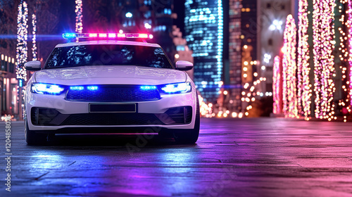police car with flashing lights parked in city at night, creating vibrant atmosphere