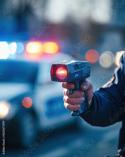 Police officer in uniform aiming a radar gun at a speeding vehicle on the highway, representing traffic enforcement, driver compliance, and the legal consequences of exceeding speed limits.