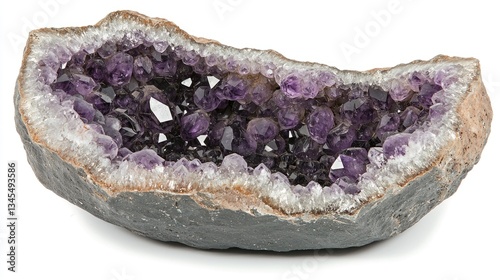 Polished amethyst geode with purple crystals inside, isolated on white background.