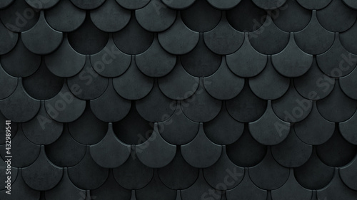Polished, Concrete Mosaic Tiles arranged in the shape of a wall. Fish Scale, Semigloss, Bricks stacked to create a 3D block background. 3D Render