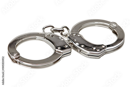 Polished metal handcuffs featuring intricate locking mechanisms, seen against a transparent background