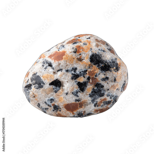 Polished, oval-shaped stone. Variegated colors of tan, brown, and black. Rounded edges