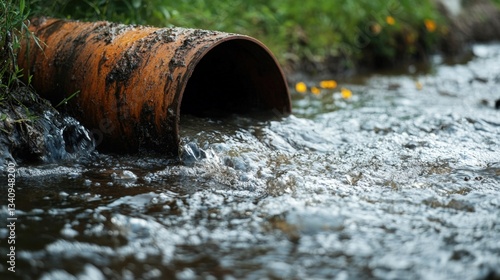 Polluted Drain Pipe with Contaminated Water Flowing into Nature