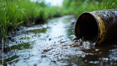 Polluted Water Flowing from Abandoned Pipe in Green Surroundings Toxic Waste Environment : Generative AI