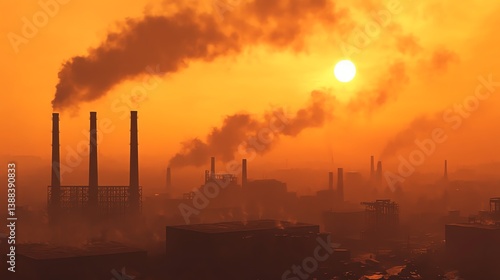 Pollution From Factories Creates Dense Smog at Sunset in Industrial Area