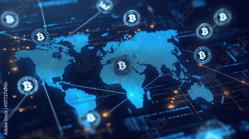 Polygon world map with blockchain technology peer to peer network on blue background. Network, p2p business, e-commerce, bitcoin trading and global cryptocurrency blockchain business banner concept.