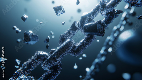 Polygonal Broken tearing chain. Breaks the chain business Vector mesh spheres from flying debris. Thin line concept. Blue structure style illustration