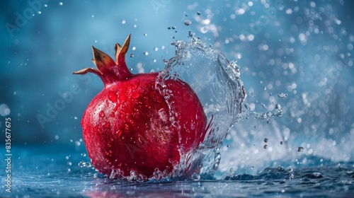 Pomegranate fruit and water splash. captured with highspeed photography as they break through the waters surface.