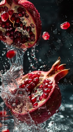 Pomegranate fruit and water splash. captured with highspeed photography as they break through the waters surface.