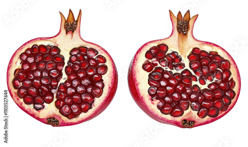 Pomegranate halves showcasing vibrant red seeds, juicy interior, and textured skin. Fresh fruit, healthy snack, rich in antioxidants, visually appealing., isolated on transparent background, png