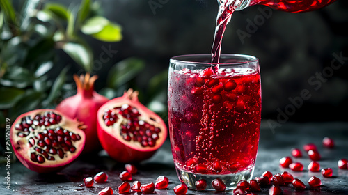 Pomegranate juice being poured into a glass with pomegranate seeds scattered