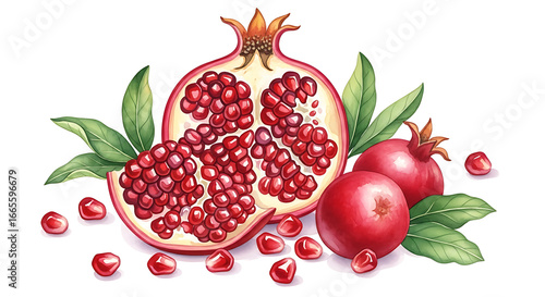 Pomegranate with cut in half isolated on white background. Clipping path., Fresh ripe pomegranate with cut in half isolated on white background.