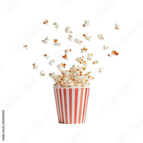 Popcorn in a red and white striped paper cup, flying isolated on a transparent background