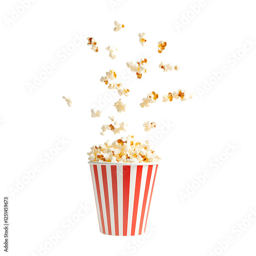 Popcorn in a red and white striped paper cup, flying isolated on a transparent background