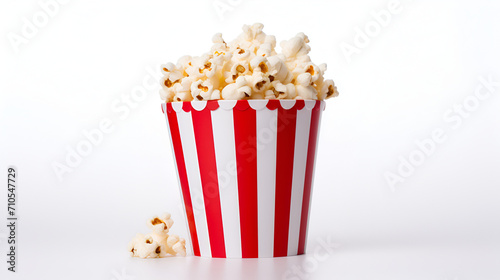 Popcorn in red and white striped cardboard bucket on white background generated AI