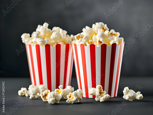 Popcorn in striped paper glasses professional food shot. Commercial photo on dark background. High quality