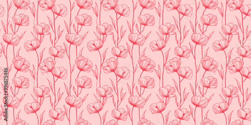 Poppy floral pattern. Pink and red vector seamless botanical ornament. Elegant summer background texture with linear flowers, leaves, poppies. Line art style. Simple modern minimal repeated design