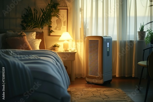 Portable mobile air conditioner stands in the bedroom at home, copy space