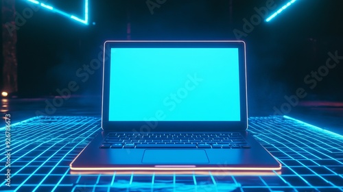 Portable neon computer with a blank screen on a desk in a dark room with blue lighting featuring a laptop with neon blue light on a digital grid symbolizing cuttingedge technology