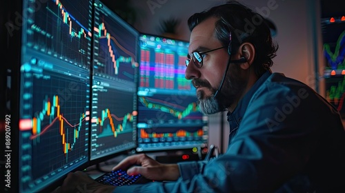 Portfolio Manager Analyzing Complex Charts with Focused Expression on Multiple Screens in Minimalist Office Setting
