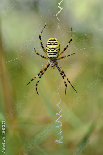 Portrait close up of a wasp spider (Argiope bruennichi) sitting in its cobweb waiting for prey