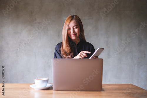 Portrait image of a businesswoman using smart phone and laptop computer in office