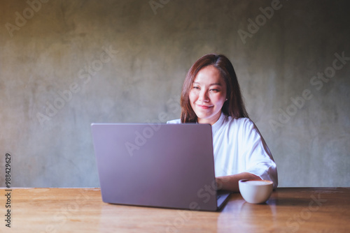 Portrait image of a young woman working on laptop computer
