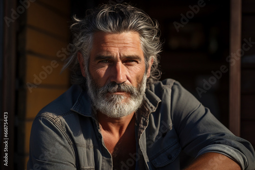 Portrait made with generative AI technology of a handsome confident man sitting on the street