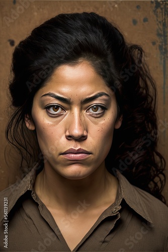 Portrait mug shot of a serious hispanic woman, Image generated with generative AI