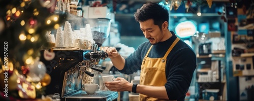 Portrait of a barista preparing coffee in a festive-themed cafe.
