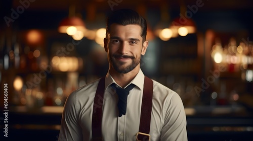 Portrait of a bartender against bar atmosphere background with space for text, background image, AI generated