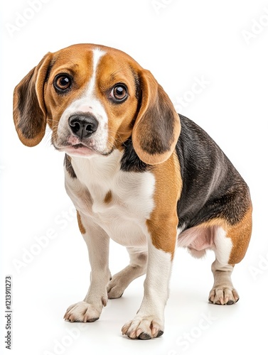 Portrait of a Beagle Dog Sitting on White Background, Showing a Pensive Expression