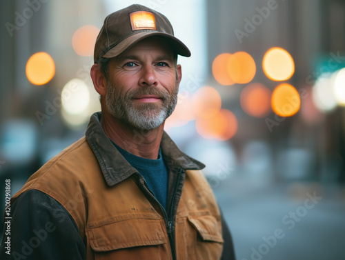 Portrait of a Bearded Man in Urban Setting with Bokeh Lights