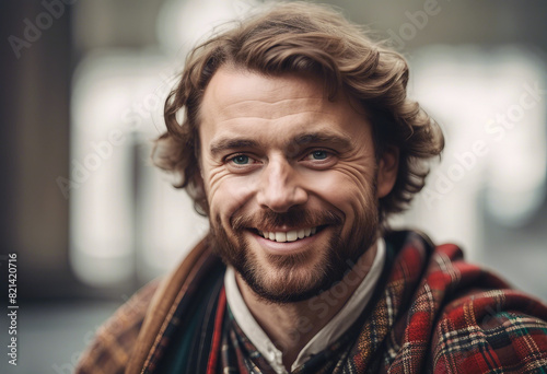 portrait of a beautiful Scottish man in traditional dress with sincere smile, isolated white background