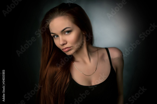 portrait of a beautiful young red-haired girl on a dark black background in the studio, with a cleavage and big breasts in black