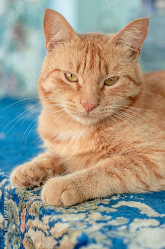 portrait of a big ginger cat, a pet is lying, look at the camera with yellow eyes