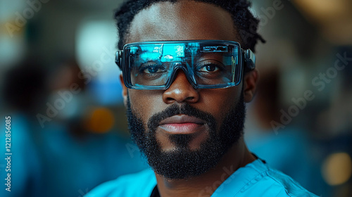 Portrait of a Black Male Surgeon Using an AR Headset, Analyzing Vital Patient Data Only Visible in Extended Reality Glasses, His Team Helps with the Medical Operation in a Hospital